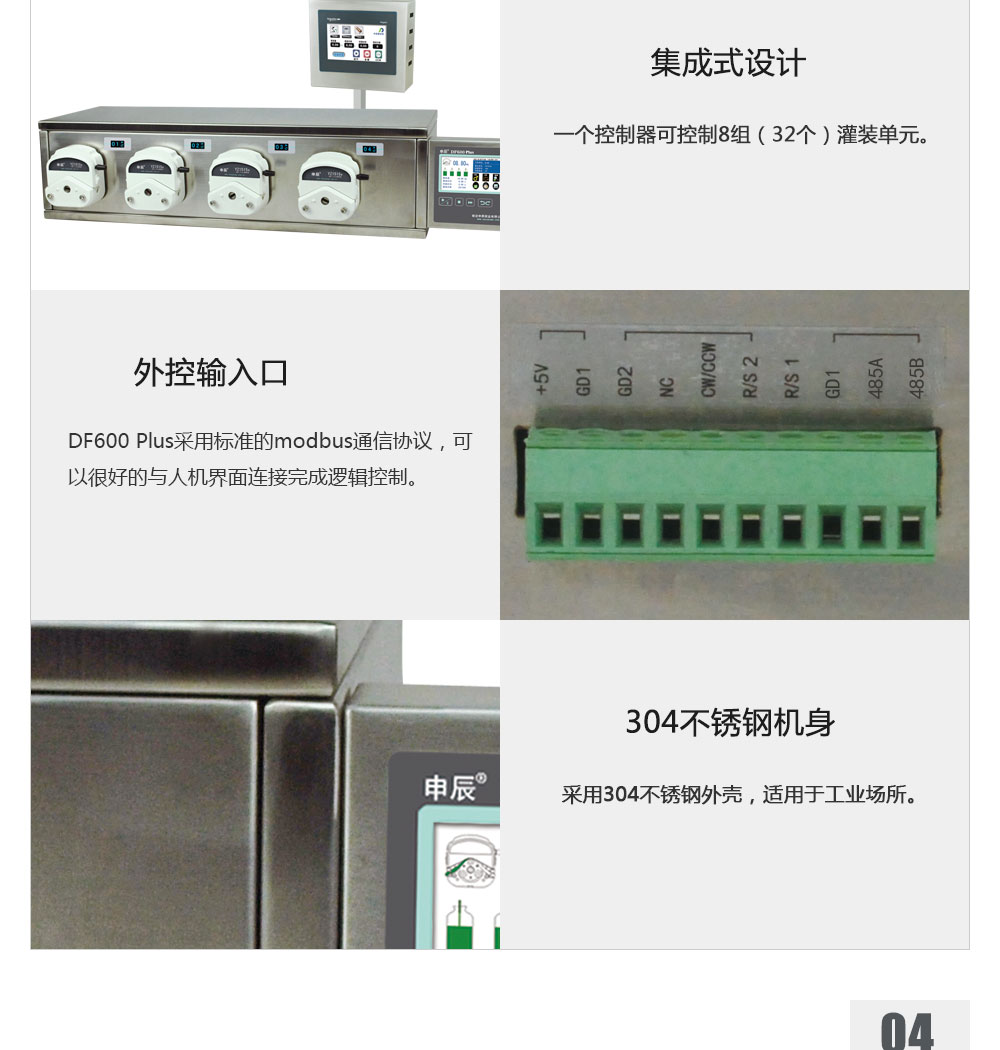 具备智能校准和在线微调功能。 可连接脚踏开关或接收开关量信号,实现远程控制。 特有电机运行状态输出信号,可供其他设备实时监测 当前蠕动泵灌装状态。 重视用户体验,适合无污染、高精度灌装液体。