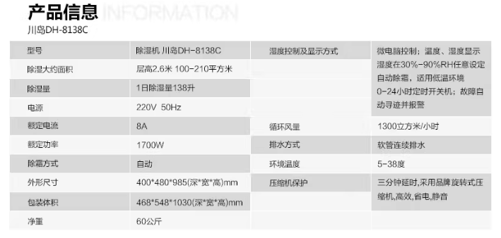 川岛除湿机DH-8138C地下室工业抽湿器别墅大功率车间仓库干燥机